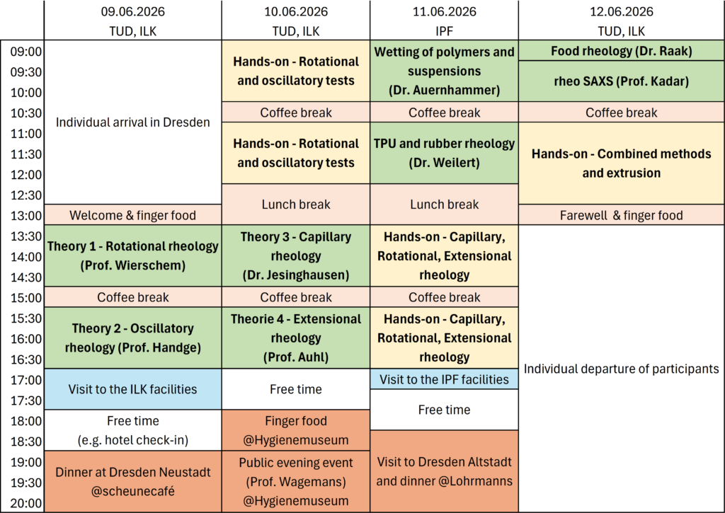 To register, please send an email to michael.mueller-pabel@tu-dresden.de (concept registration djR Summer School 2026). Please include your full name and affiliation (institute, university, company) as well as a short description of your background in rheology, the topic you are working on, and your goals/open questions. You don’t need to send more than half a page, and this information will help us to better prepare the open lab part!